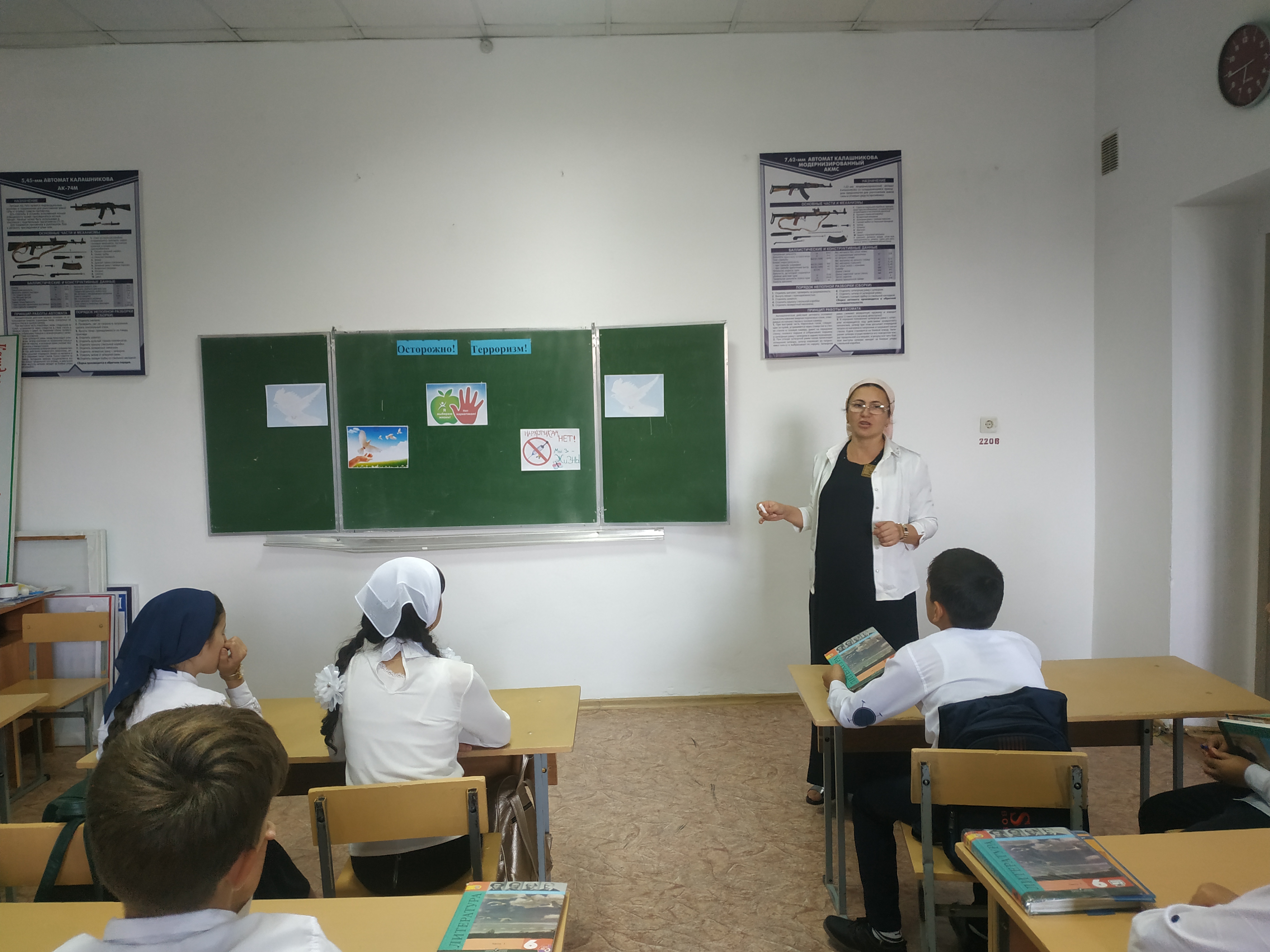 В 3а классе классный руководитель Косумова Х.Х. провела классный час «Терроризм». Учащиеся вместе с учителем рассматривали и обсуждали ситуации из повседневной жизни. Учитель провела беседу по основным правилам поведения во время теракта.