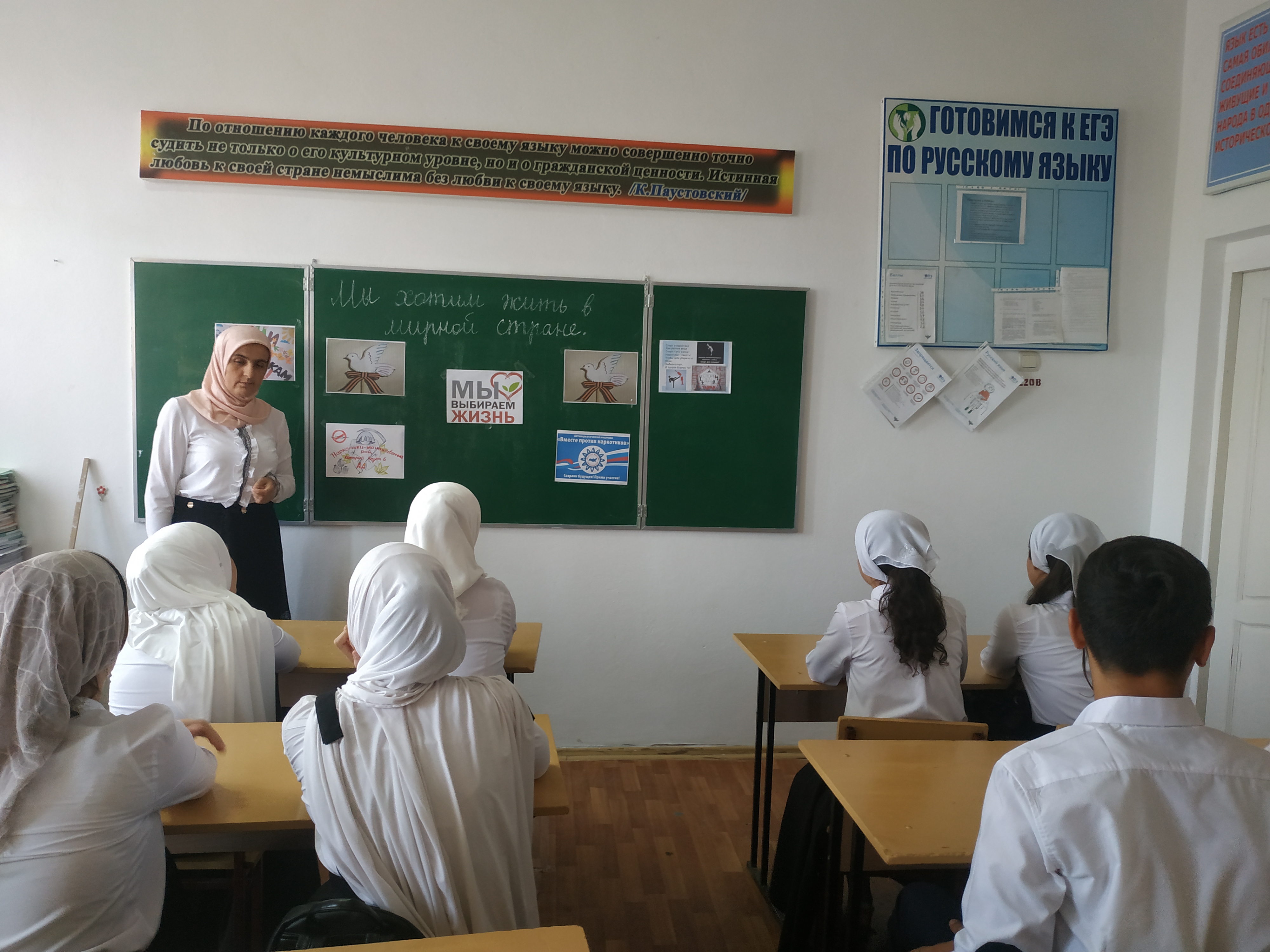 Эдельхановой А.Х. был проведен классный час «Мы хотим жить в мирной стране, задачами, которого являлись воспитание патриотизма и чувства долга перед Родиной, развитие гражданственности, чувства ответственности за себя и свое будущее, свою семью и близких, будущее России. Также классным руководителем был проведен инструктаж по противодействию экстремизма, направленный на исключение случаев национальной вражды и воспитание толерантности.