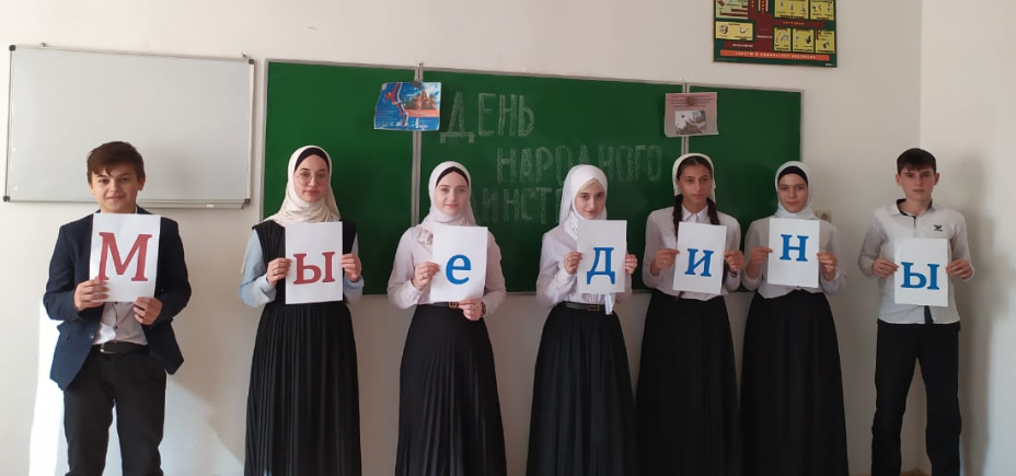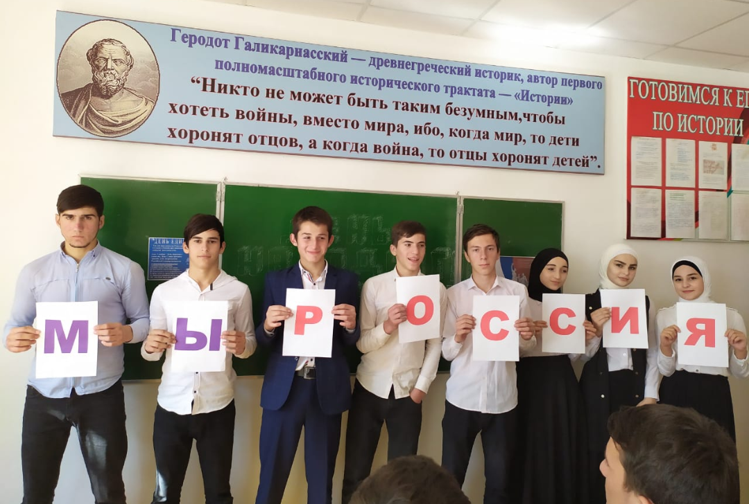 Учитель истории Мушуева М.Б. с целью привития любви к родному краю, гордости за свой народ, пробуждения интереса к истории России, воспитания чувства патриотизма, любви к своей стране провела для обучающихся 9-х классов исторический час «Мы-Россия», в ходе мероприятия обучающиеся познакомились с историей возникновения праздника, подвигами наших предков во имя независимости Родины.