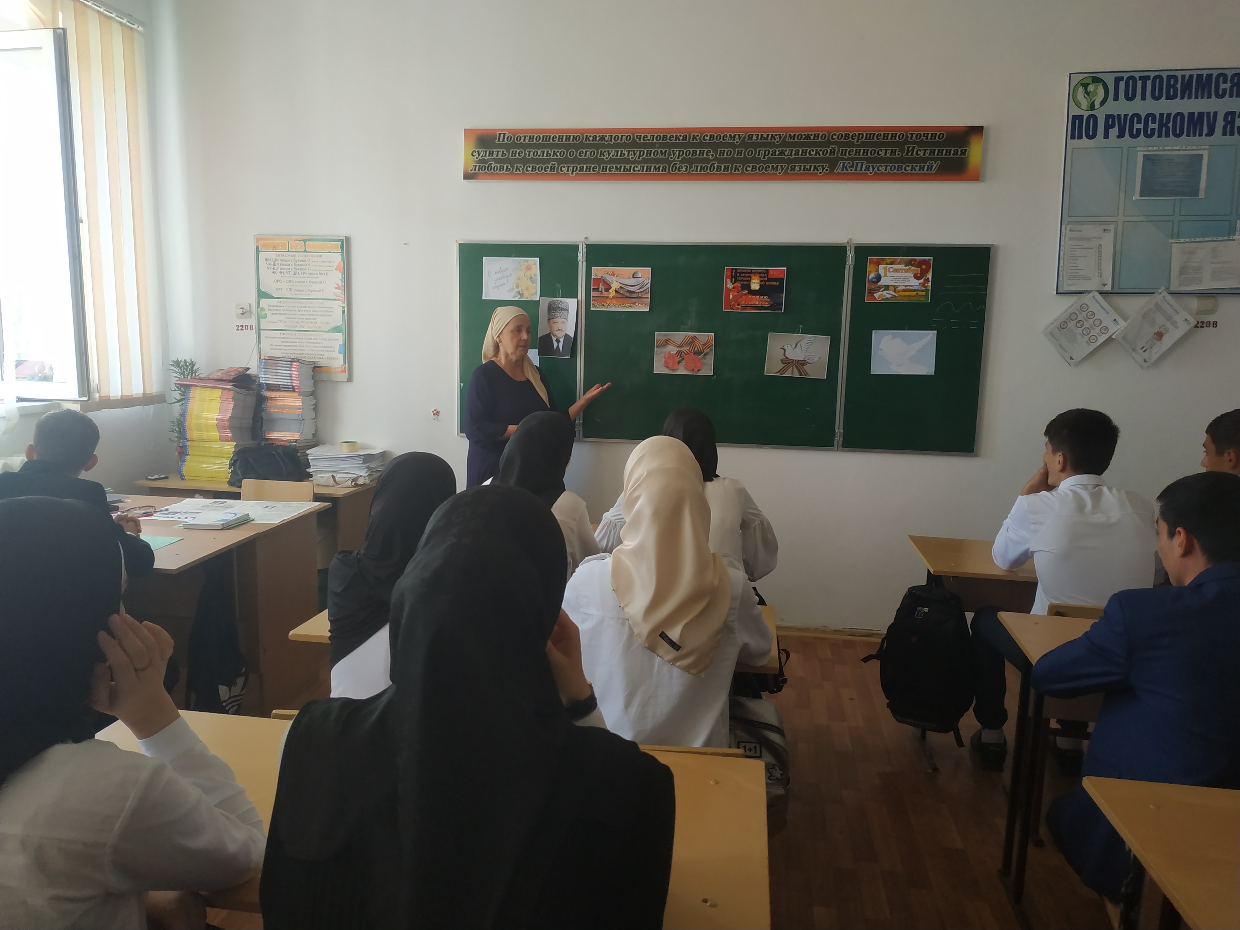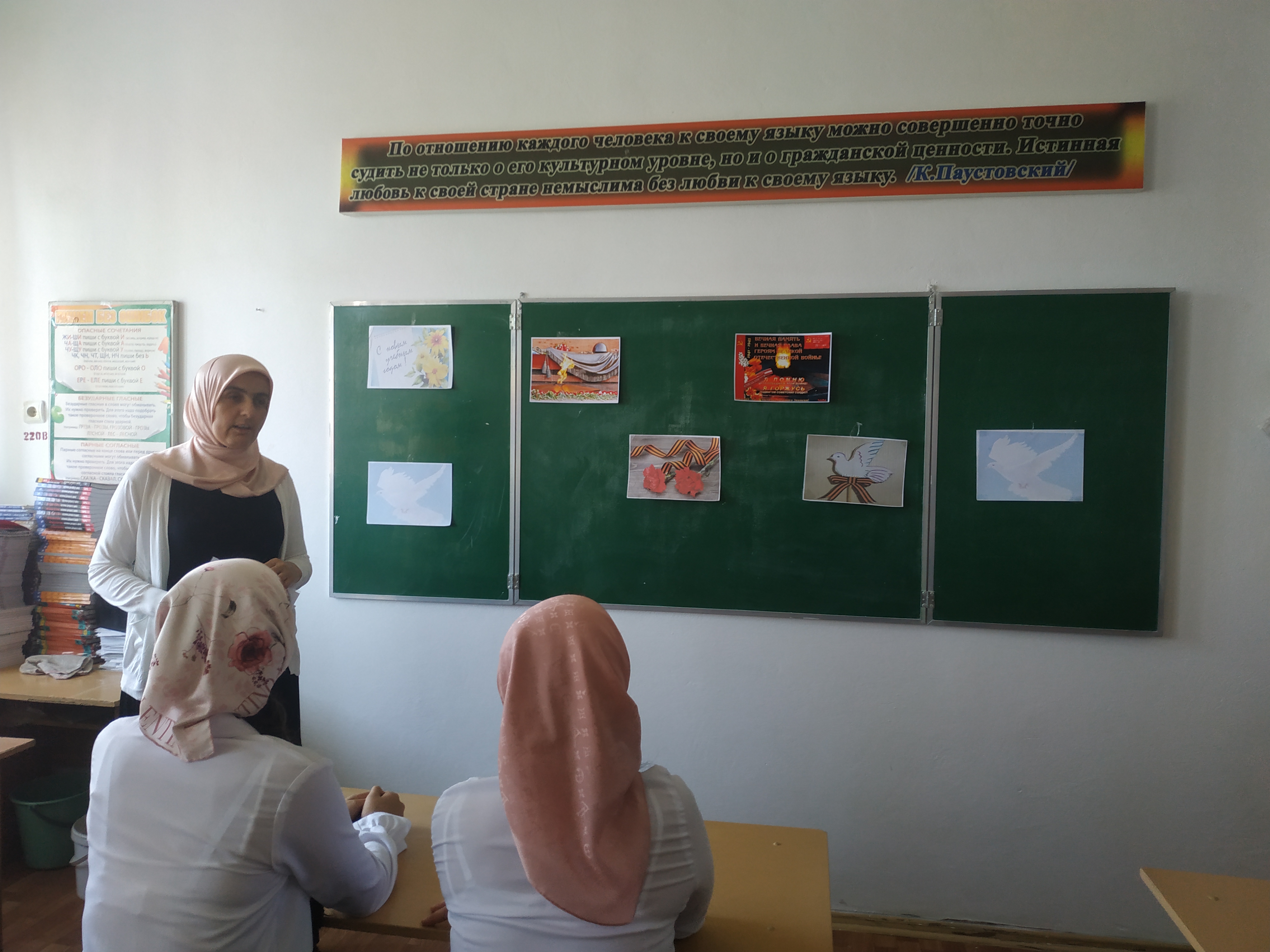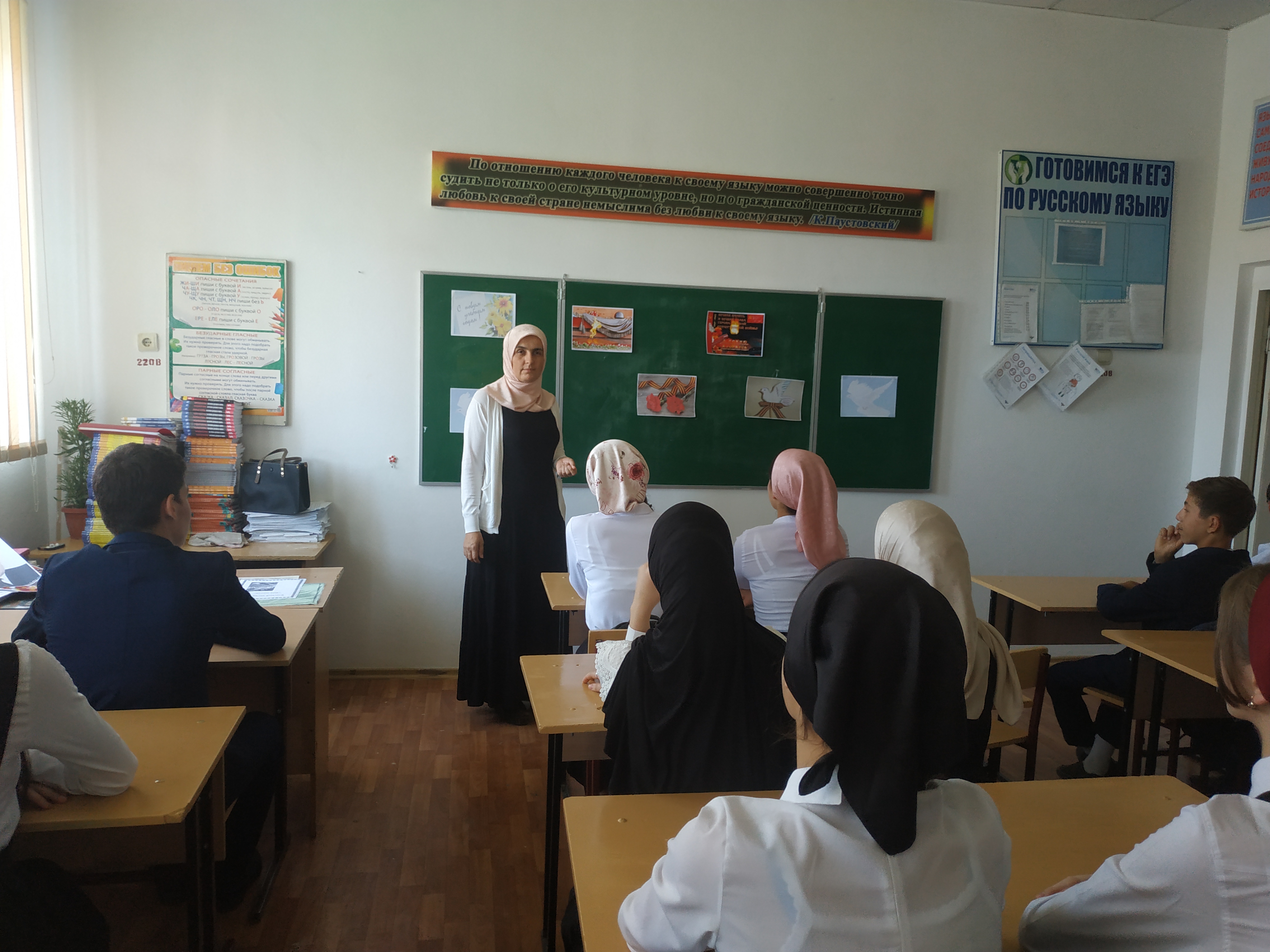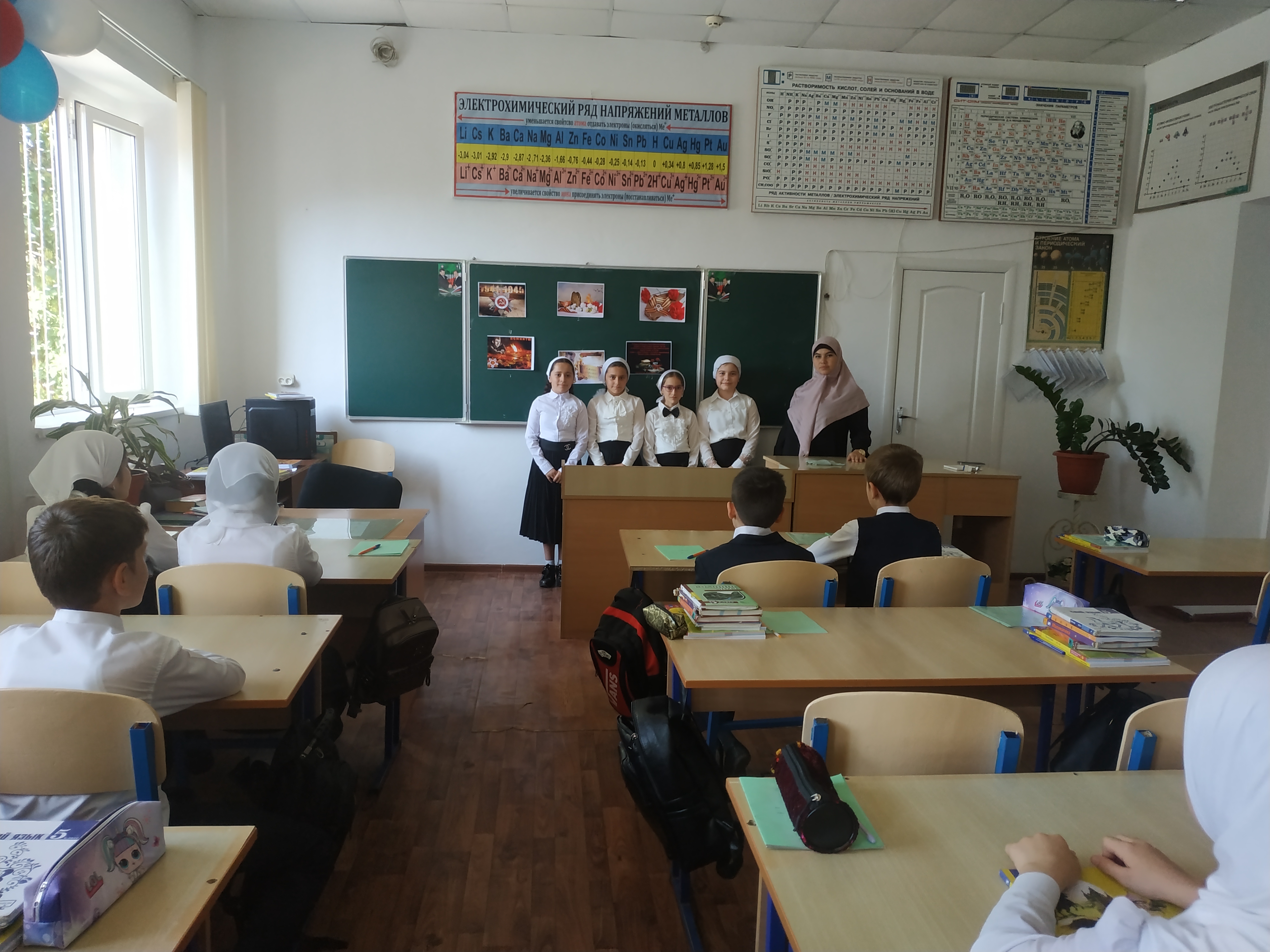 Подготовка к празднованию началась с праздничного оформления здания и территории школы. Многие кабинеты были украшены изображениями символов Победы: голубями, георгиевскими ленточками, гвоздиками.