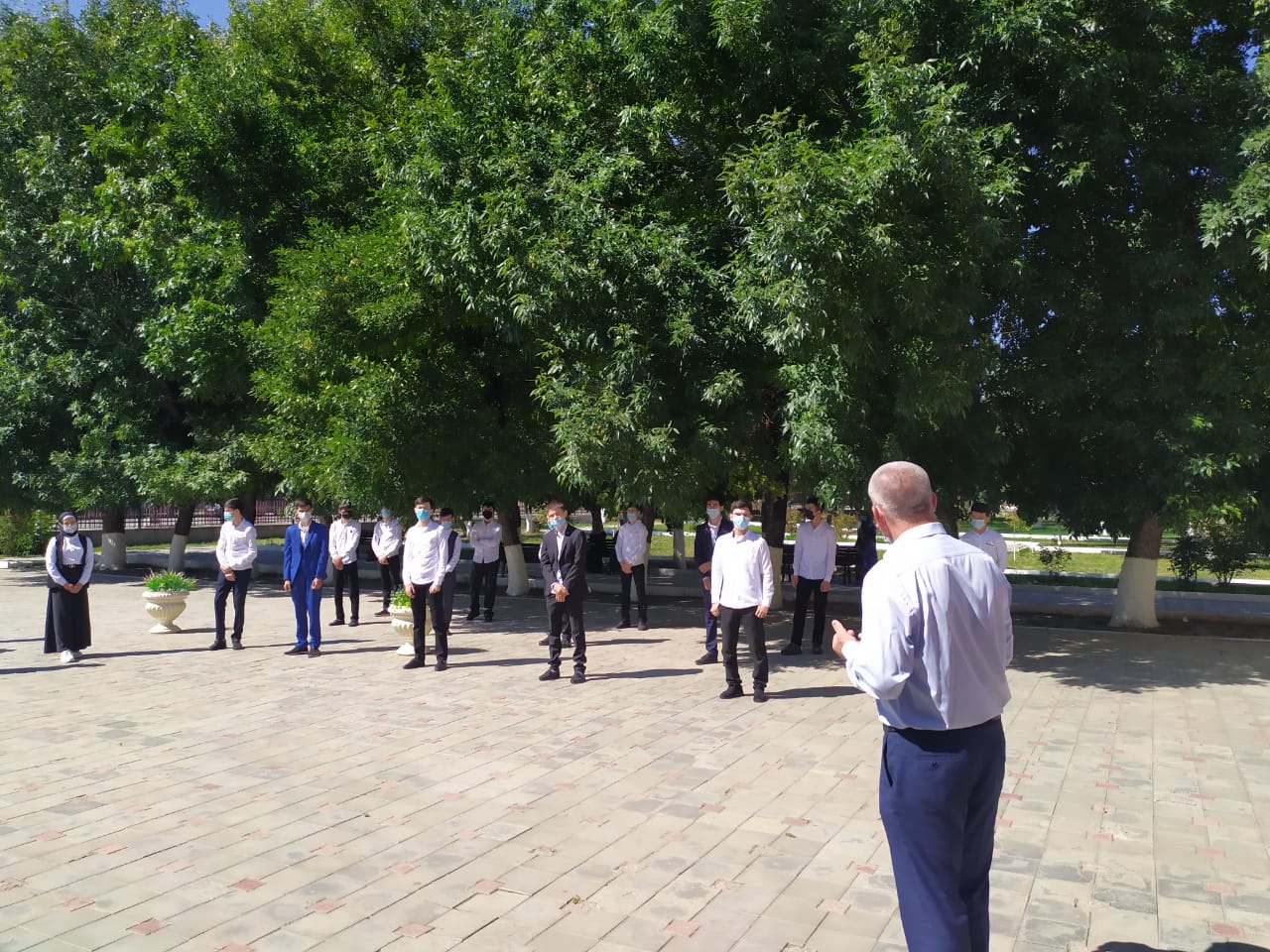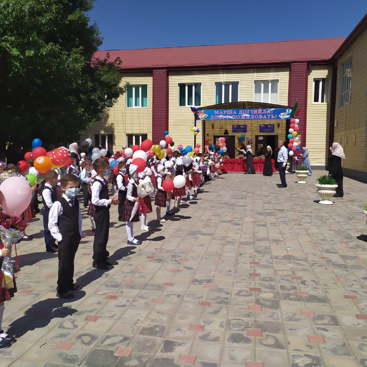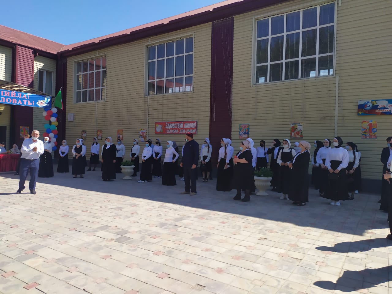 В связи с запретом проведения массовых мероприятий торжественная линейка, посвященная Дню знаний, состоялась только для учеников 1 и 10 классов. Линейка проходила на площадке возле школы.
