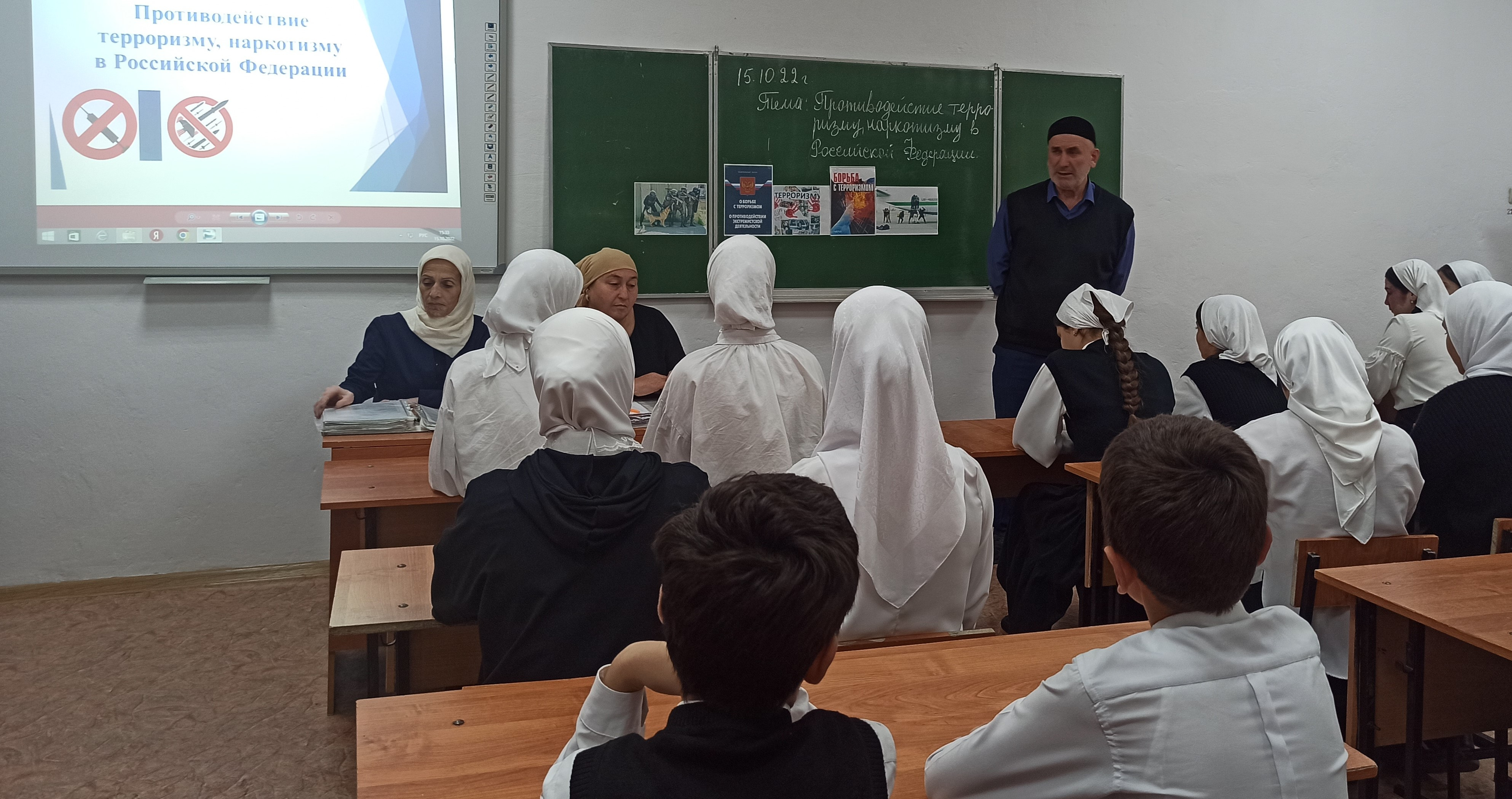 На мероприятии присутствовали: заместитель директора по ВР Хасанова Е.А., заместитель директора по ИКТ и педагог-психолог школы Дачаева Г.Э. Была использована презентация «Противодействие терроризму, наркотизму в РФ».