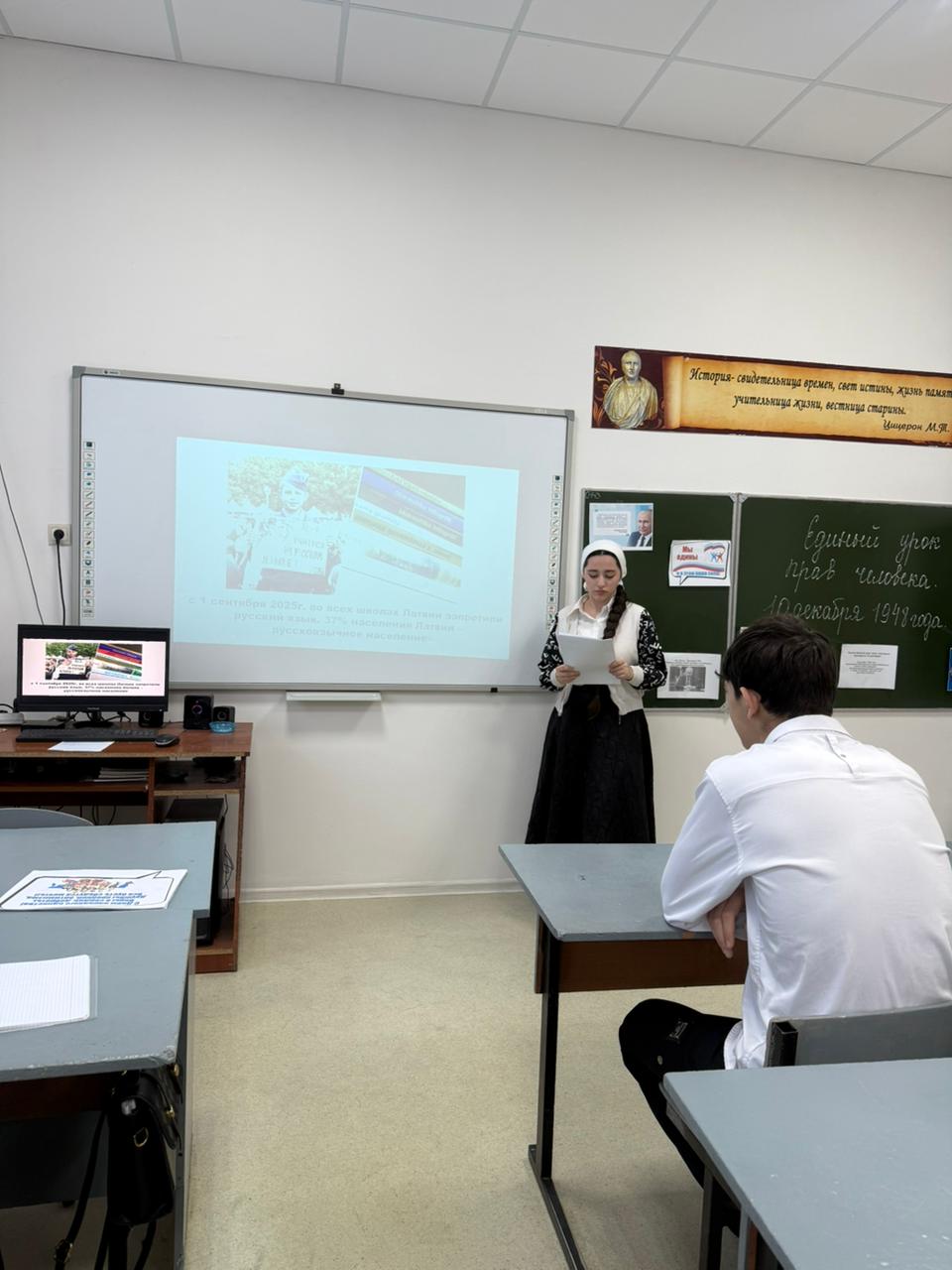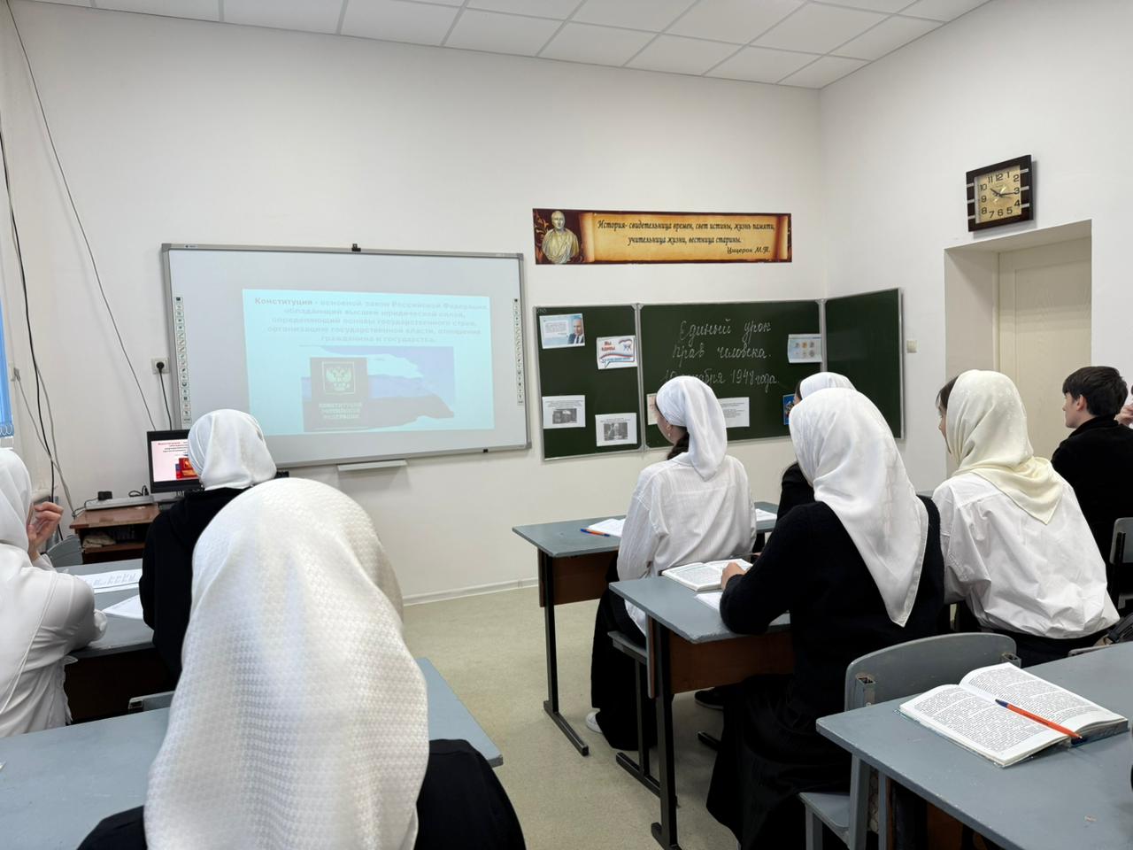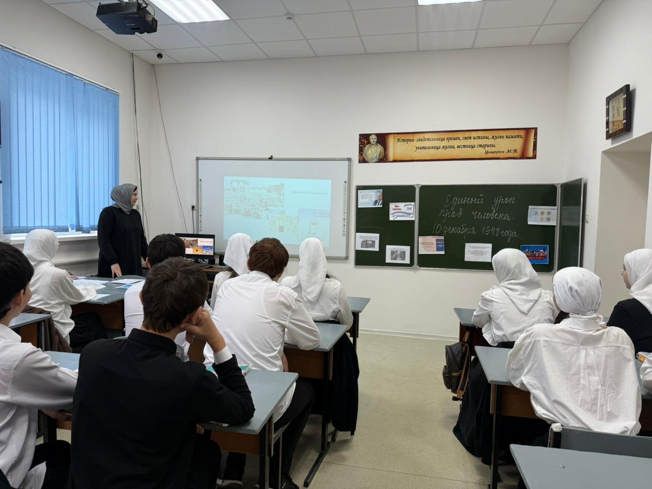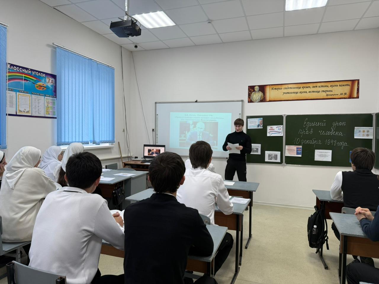 05.12.2025 г. в МБОУ «Средняя школа №5 г.Ойсхара им.К.Л.Тепсуева» учителя истории и обществознания провели единый урок «Права человека» с учащимися 9-11-х классов.